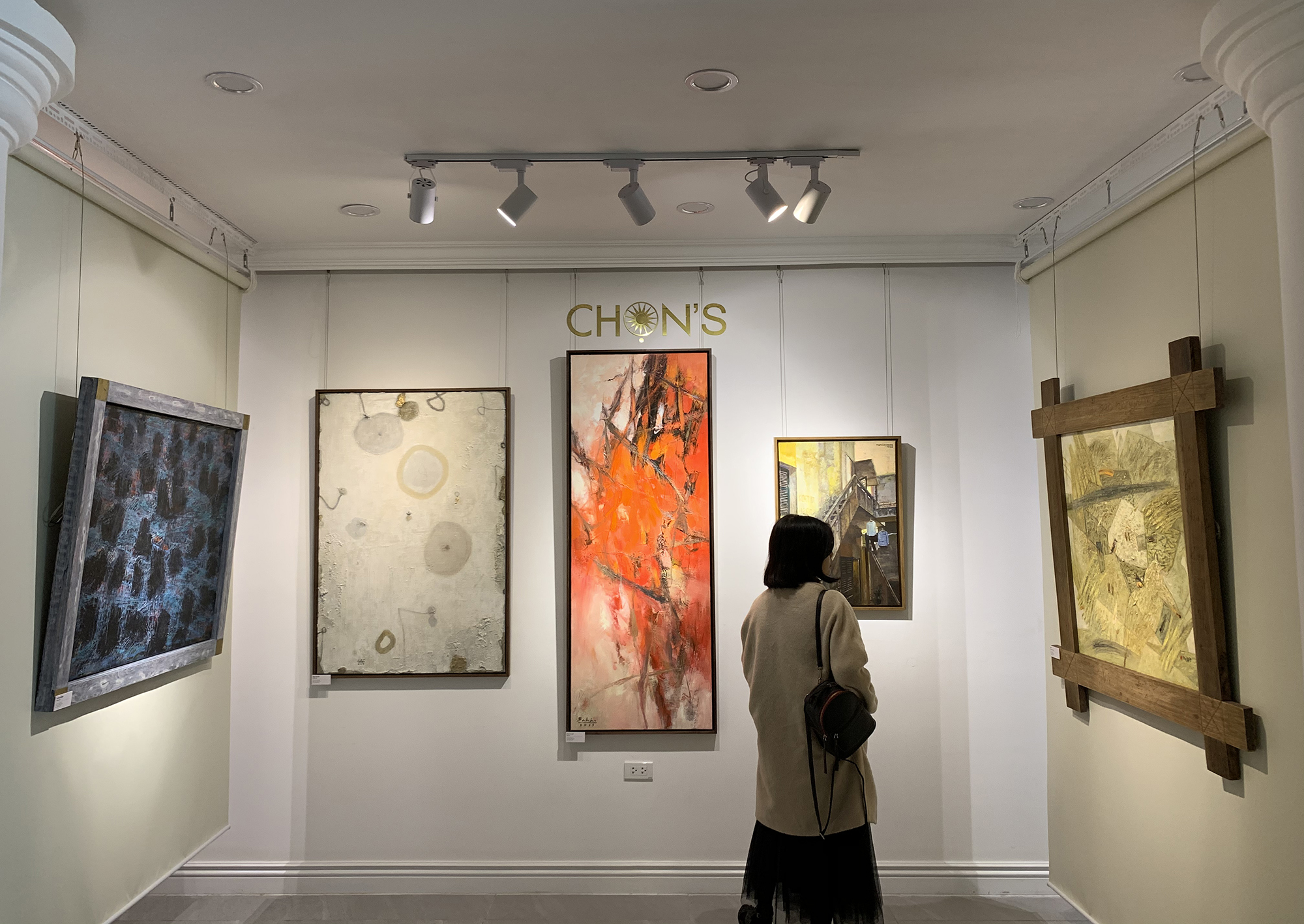 The painting "Meditation in Brown" (top left) by Pham Ha Hai in the "Viet Art Now 2019" exhibition at the Chon Auction House in Hanoi, December 2019.